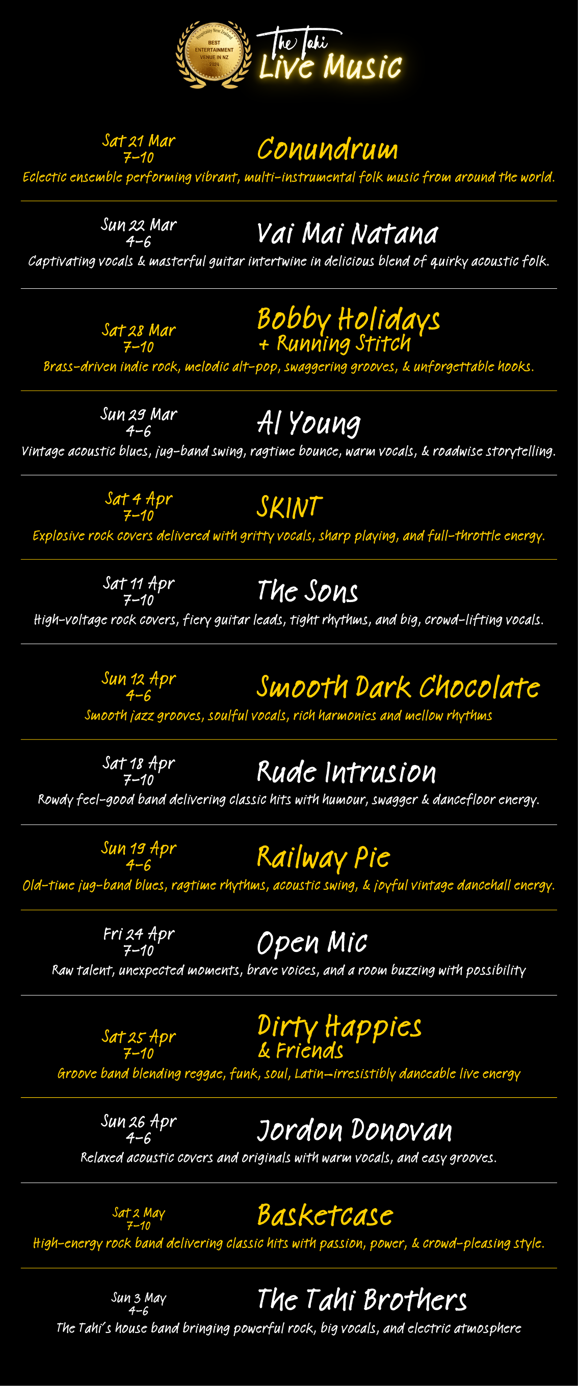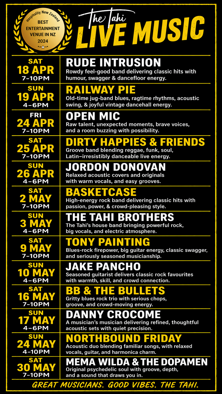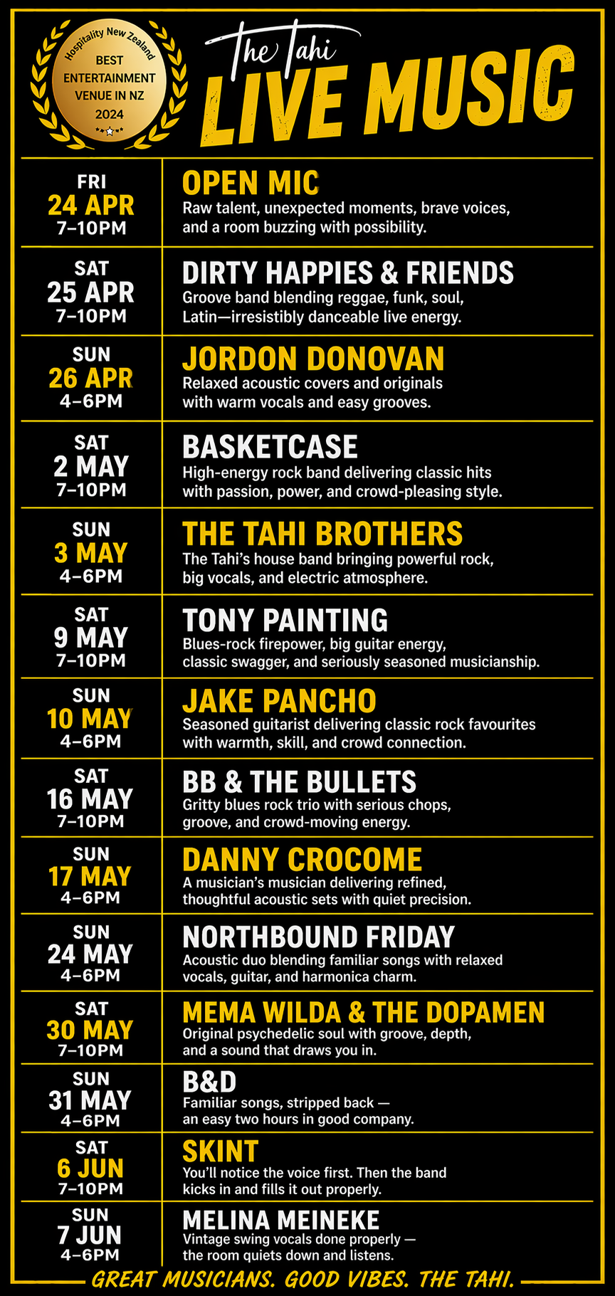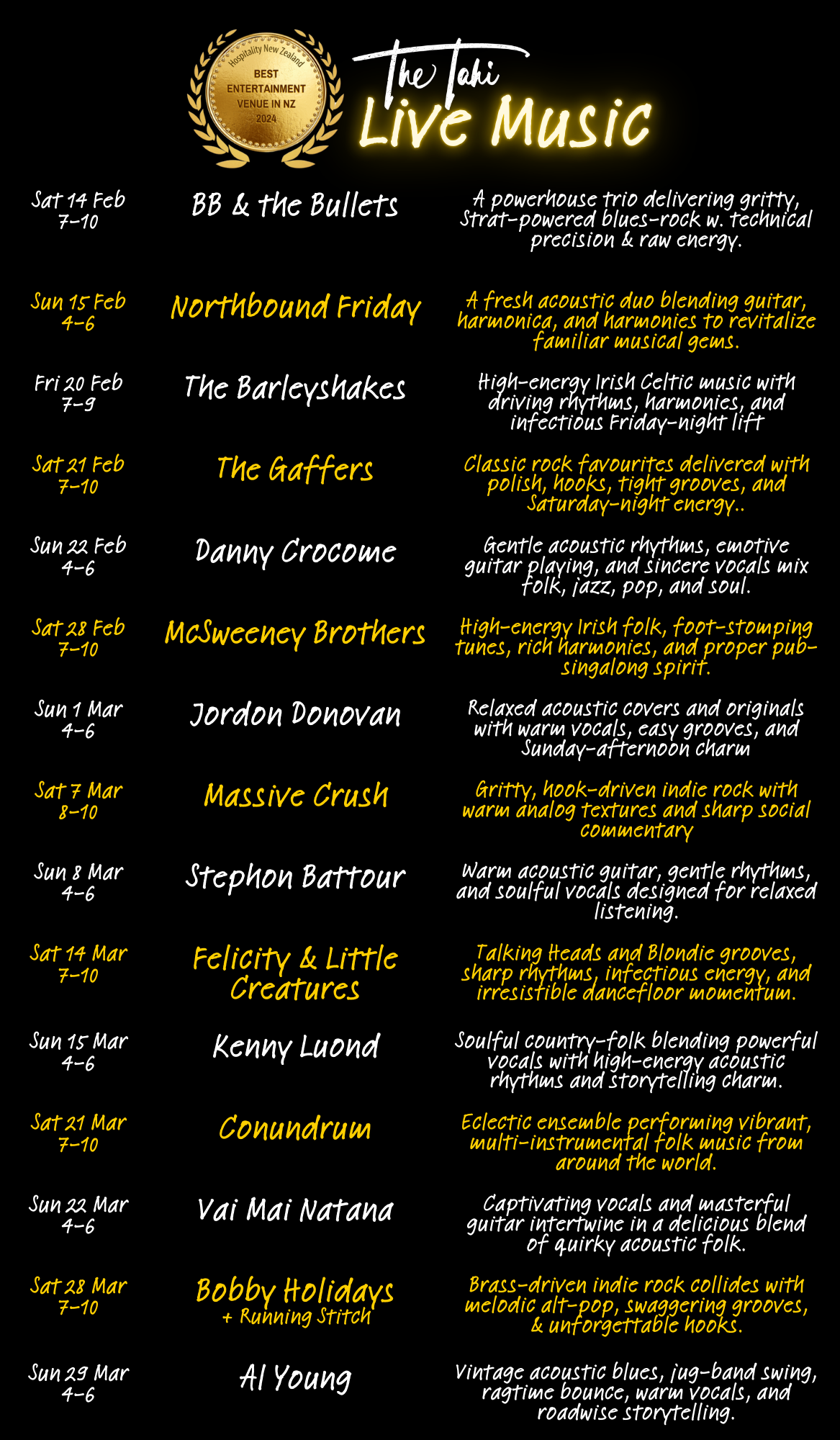 Welcome to The Tahi Bar + Kitchen, where great food, live music, and warm hospitality come together in the heart of Warkworth. Recently named New Zealand’s Best Entertainment Venue by Hospitality NZ and named as a Top 50 New Zealand Gastropub, for two years in a row, we’re proud to be recognized for creating unforgettable experiences. Nestled down an alley in this charming riverside town, we serve up delicious, locally sourced dishes in a cozy, welcoming space that’s perfect for enjoying live music, good company, and the best of Warkworth.