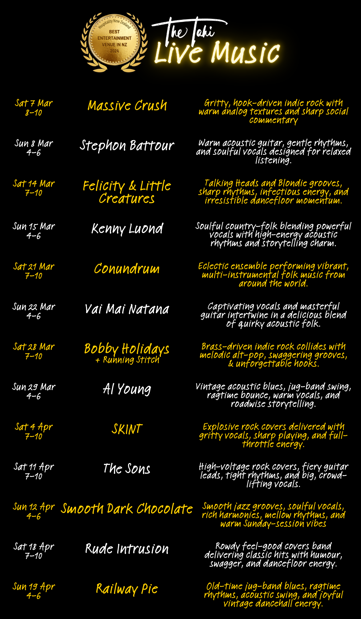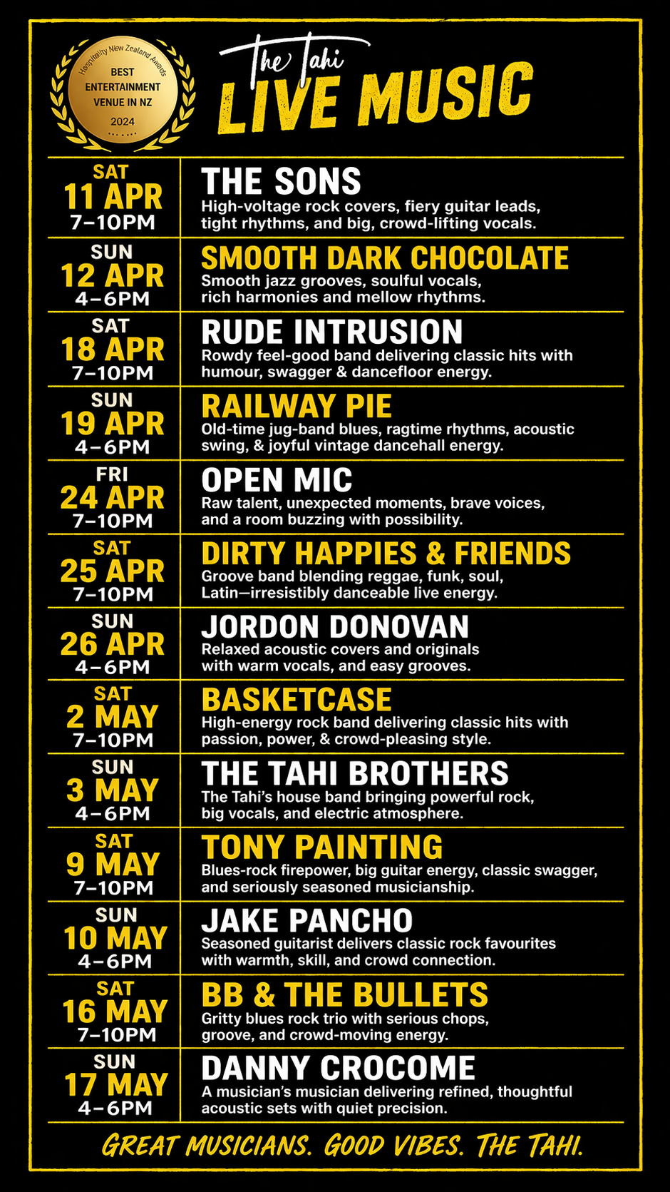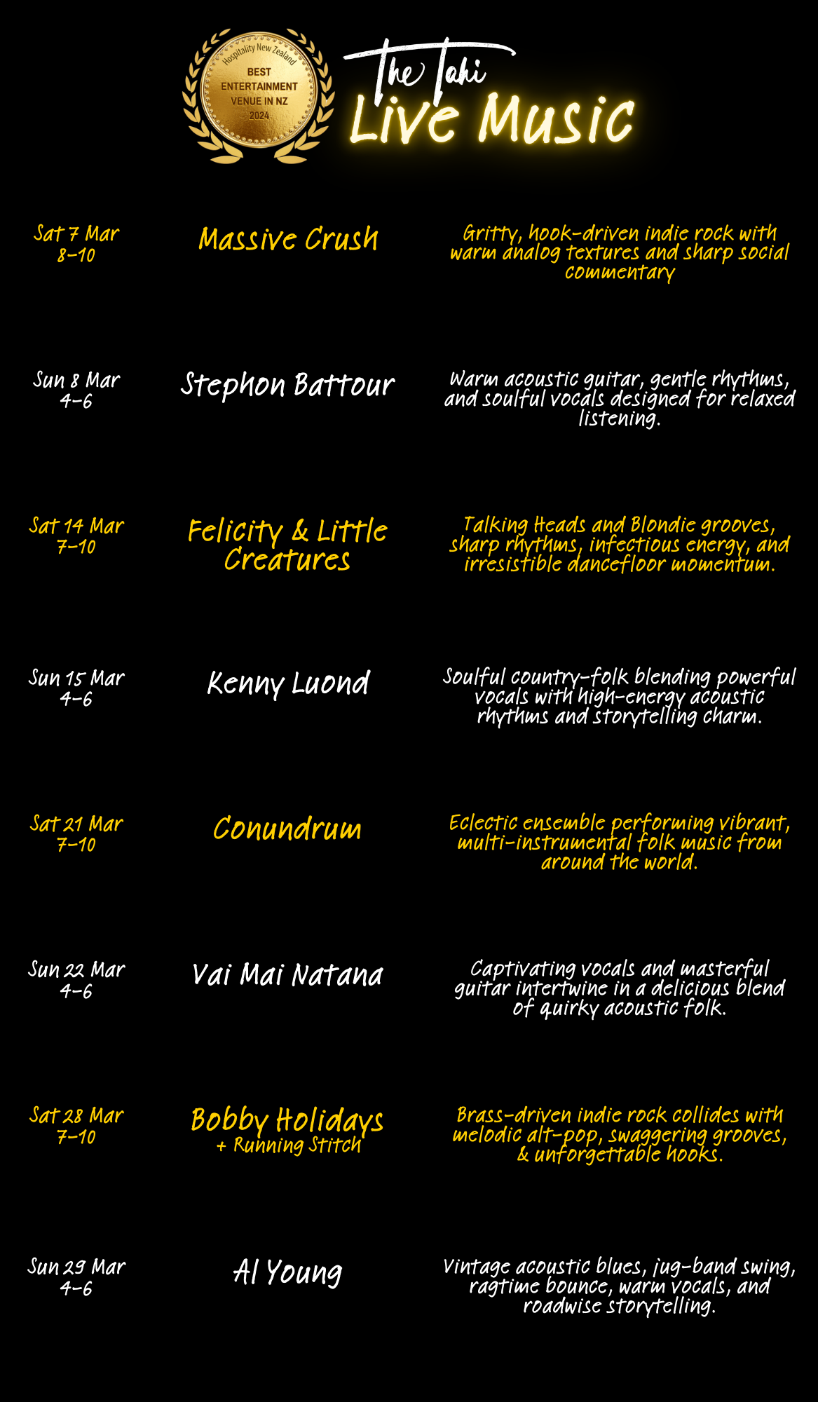 Welcome to The Tahi Bar + Kitchen, where great food, live music, and warm hospitality come together in the heart of Warkworth. Recently named New Zealand’s Best Entertainment Venue by Hospitality NZ and named as a Top 50 New Zealand Gastropub, for two years in a row, we’re proud to be recognized for creating unforgettable experiences. Nestled down an alley in this charming riverside town, we serve up delicious, locally sourced dishes in a cozy, welcoming space that’s perfect for enjoying live music, good company, and the best of Warkworth.
