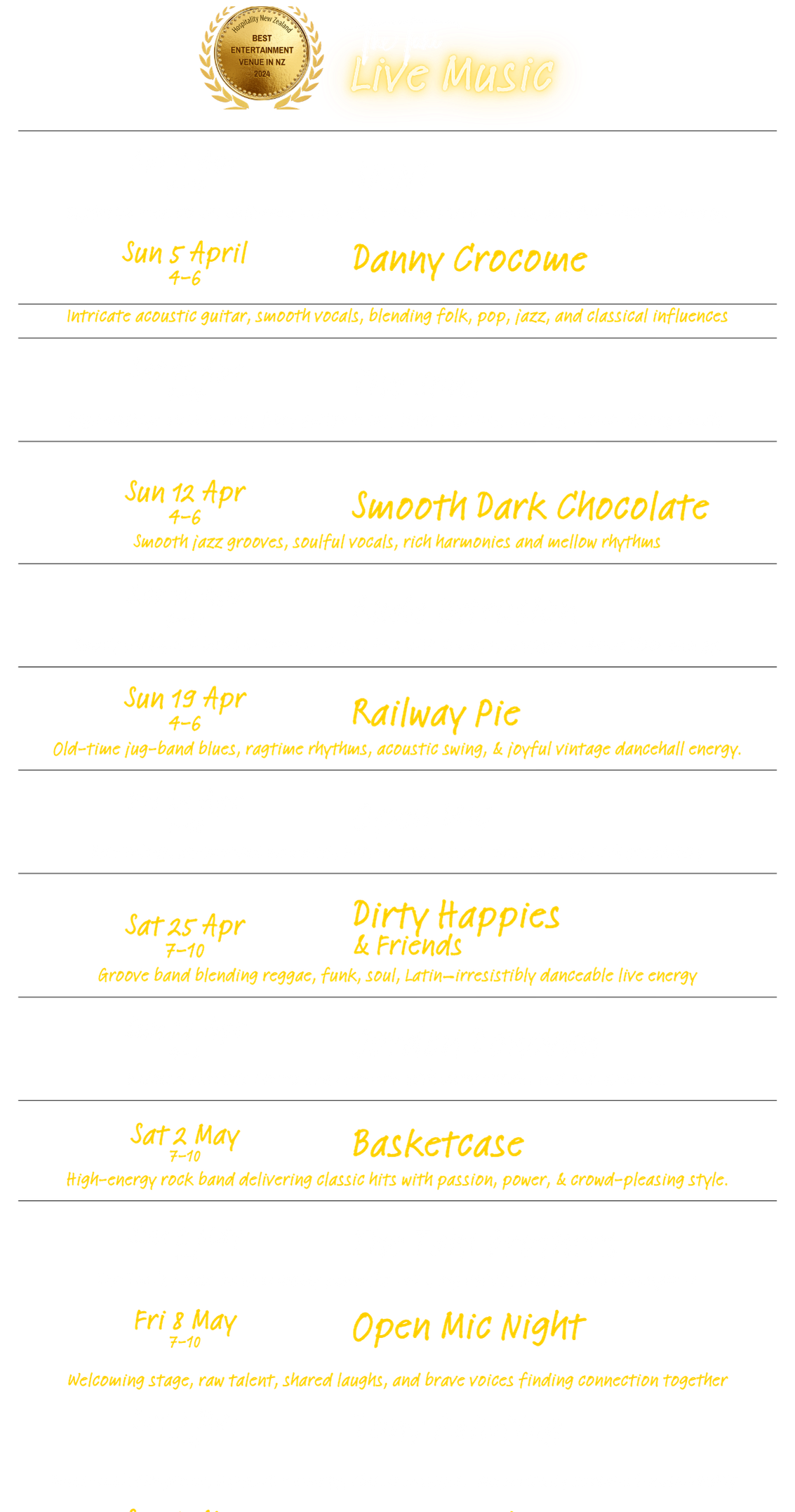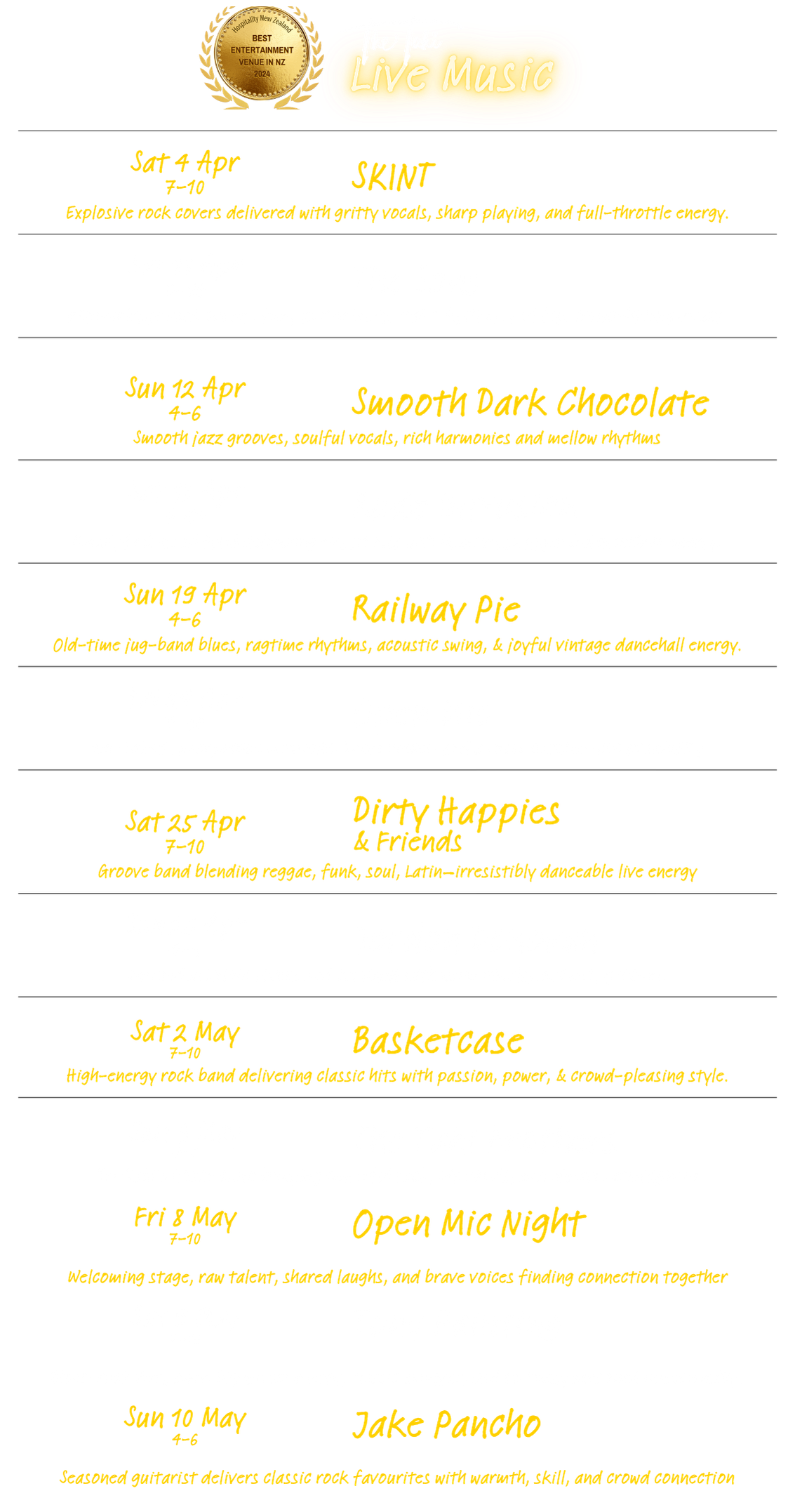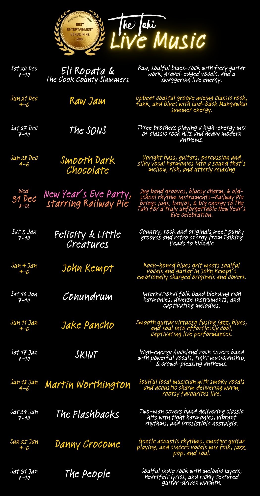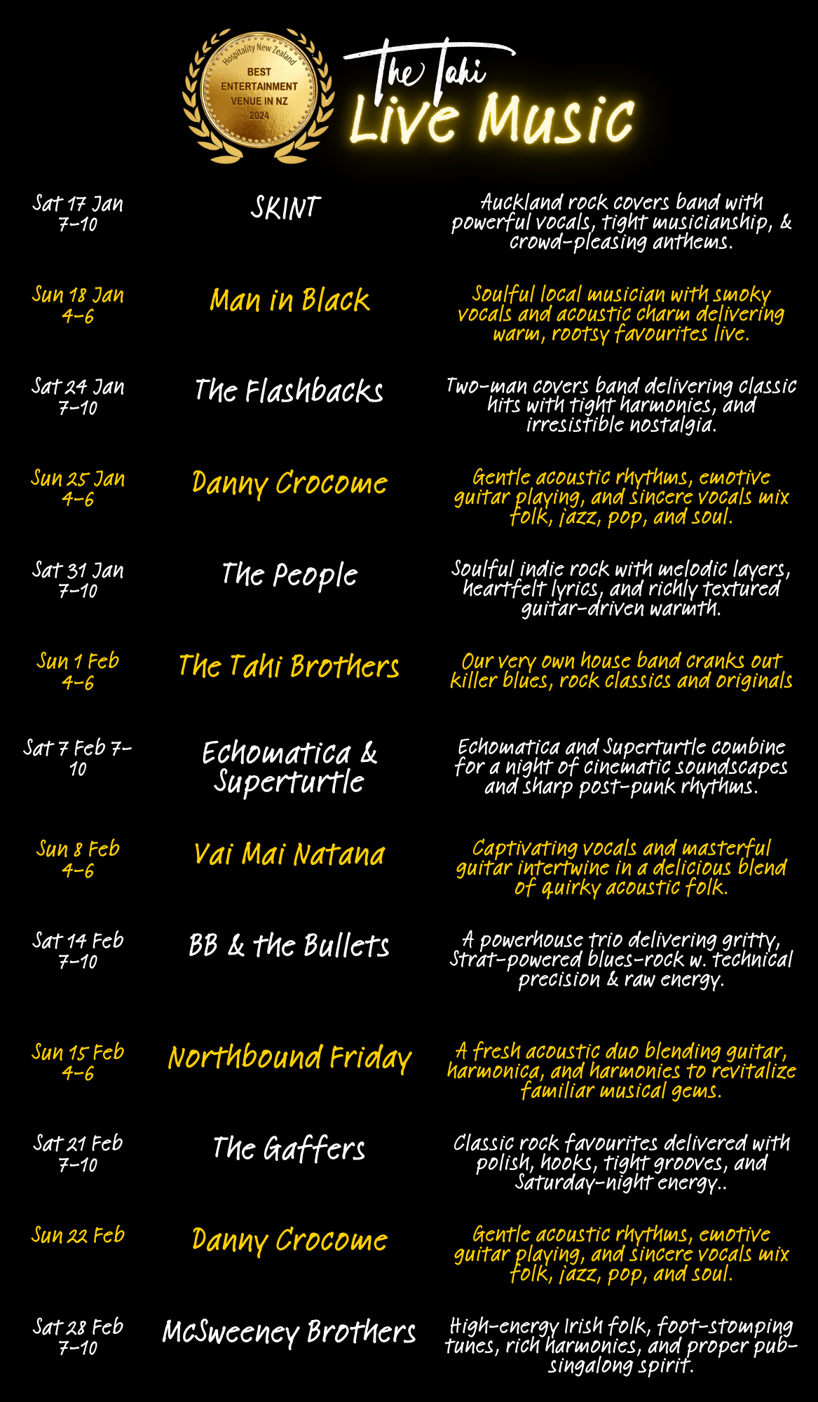 Welcome to The Tahi Bar + Kitchen, where great food, live music, and warm hospitality come together in the heart of Warkworth. Recently named New Zealand’s Best Entertainment Venue by Hospitality NZ and named as a Top 50 New Zealand Gastropub, for two years in a row, we’re proud to be recognized for creating unforgettable experiences. Nestled down an alley in this charming riverside town, we serve up delicious, locally sourced dishes in a cozy, welcoming space that’s perfect for enjoying live music, good company, and the best of Warkworth.