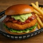 $29100% NZ free range crumb Chicken breast w garlic butter, streaky bacon, tomato relish, cos lettuce, avocado ranch on a glazed brioche bun