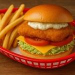 $26100% NZ Crumb Hoki Fish fillet w tomatoes, cheddar cheese, tartare sauce & shredded cos lettuce on a potato bun.